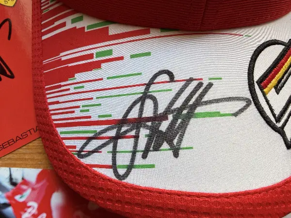 Ich biete hier ein sehr schönes, originales Ferrari Sammler-Set von Sebastian Vettel an. Das Set besteht aus einer original Ferrari Team Cap mit Autogramm sowie mehreren handsignierten Vettel Ferrari Fotos.