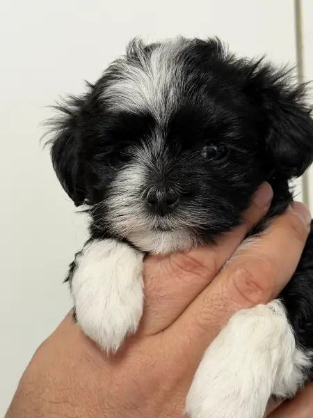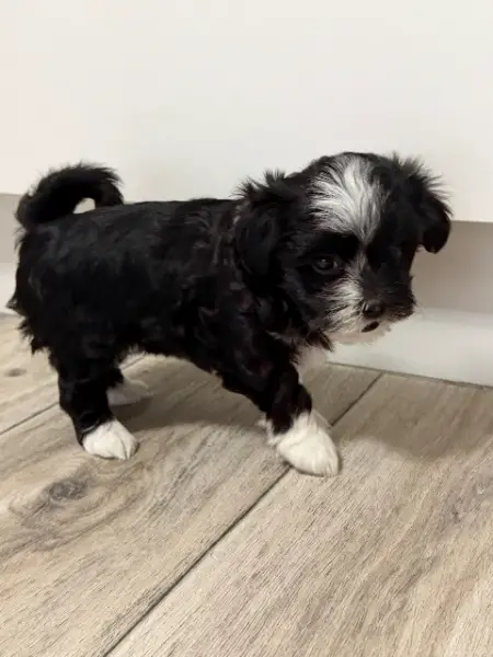 Maltiboo Welpe Schwarz Weiss weibchen, sie ist am 25.12.25 geb. Wir werden sie erst ab dem 20.03.26 an ihren Neuen Besitzer übergeben. Die Entwurmung, Impfung und Chippung wurden gemacht.