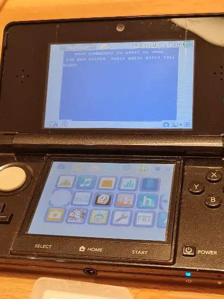 Ladekabel. Der 3DS ist mit Homebrew FW (FBI, gm9 etc.) ausgestattet.Es ist ein C64 Hintergrund installiert. Das