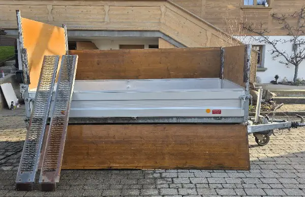 Der Anhänger ist ideal für den Transport von Schüttgut, Gartenabfällen oder Baumaterialien. Dank der Kippbrücke lässt sich die Ladung einfach entladen. Der Anhänger wird verkauft inkl. Kurbelstützen, Holzwanderhöhungen und 2 Stahlladerampen (je 180cm x 22cm; Belastbarkeit je 227kg) .