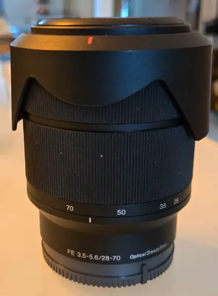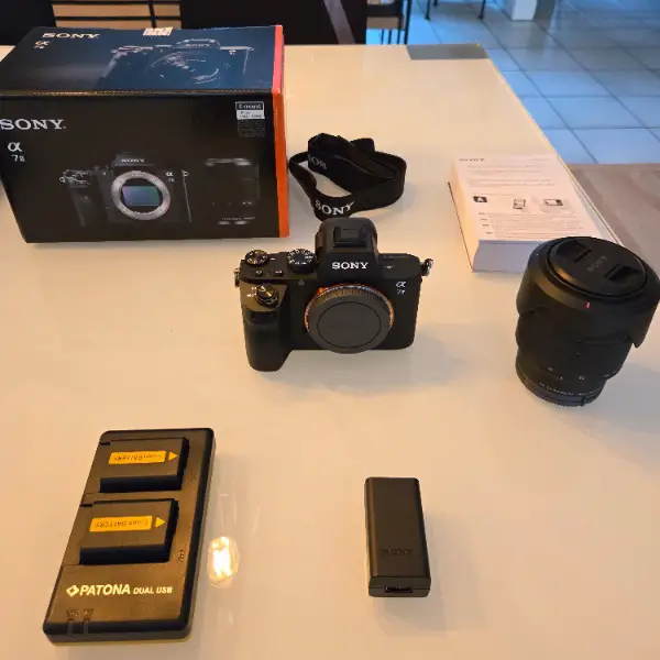 Originalverpackung, inkl Dual - Ladegerät (für Akkus gleichzeitig) , Schulterriemen, Datenkabel, 3 Akkus, Objektiv 28-70mm Blende f/3.5 - 5.6 und Gebrauchsanleitung.