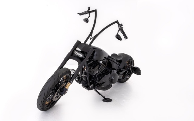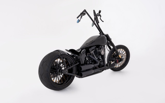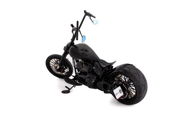 Das massive 300er Hinterrad verleiht dem Bike eine brutale Präsenz und eine unverwechselbare Linie. Der Tank sowie das Bobberheck wurden komplett als Einzelanfertigungen gebaut und perfekt in das Gesamtbild integriert. Auch der Lenker ist eine handgefertigte Sonderanfertigung, die dem Motorrad eine besonders markante und aggressive Haltung gibt.