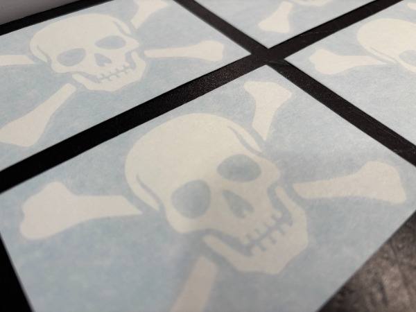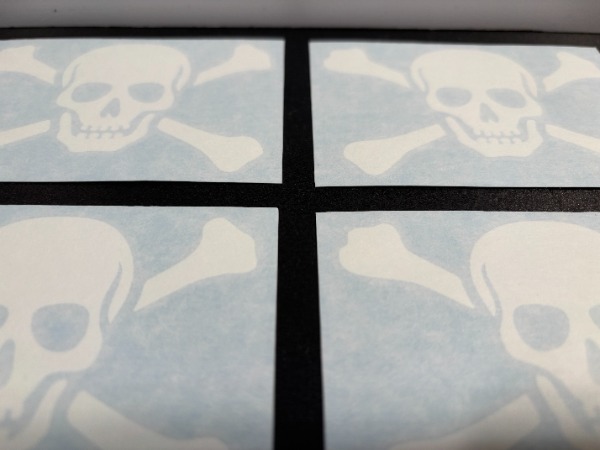 nettes Fun-Sticker 4er Set aus den USA - America mit Sujet eines Totenkopf Schädel Knochen Skull Pirat // DiCut Aufkleber: es ist NUR DER WEISSE SCHÄDEL & KNOCHEN Bestandteil des Stickers; der bläuliche Teil ist Trägerpapier // zur Kennzeichnung von Gift schädliche Stoffe Chemikalien Gefahr oder nette Abschreckung von unerwünschten Besuchern, freundliche Begrüssung von Wegelagerer Hausierer Missionare Einbrecher als Ergänzung zu Flutlicht oder Bewegungsmelder oder für an den Tresor Waffenschrank Werkstatt Garage Munitionsbox etc. // Grösse ca. Grösse ca. L 9.7cm x H 6.8cm