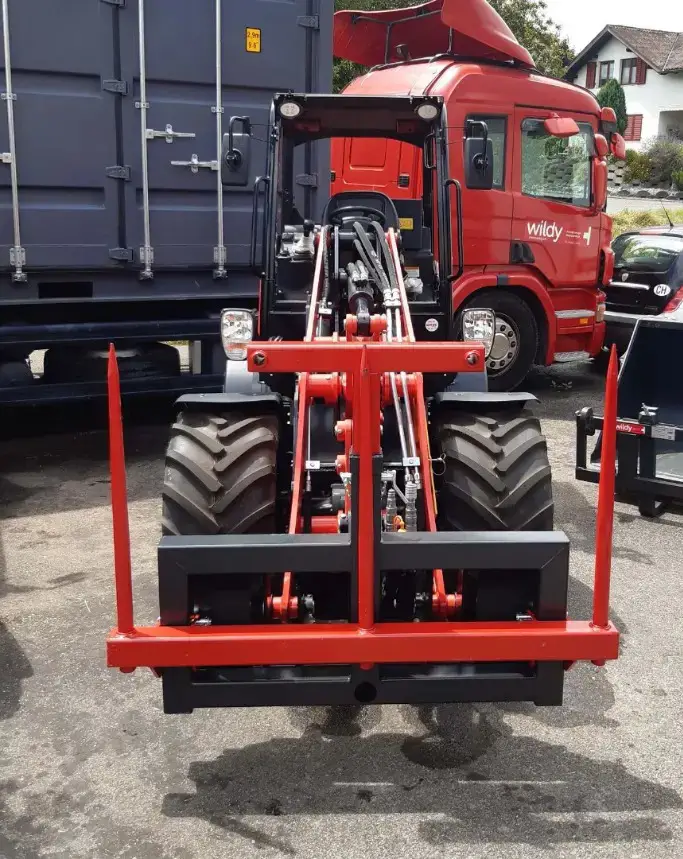 Maschine möglich. Handgas über Drehschalter einstellbar, Betriebs- und Feststellbremse auf Kardanwelle, 4-LED Arbeitsscheinwerfer am ROPS/FOPS Fahrerschutzdach oder Kabine. Hubhöhe mit Z-Kinematik-Ladeschwinge 3.20m. Höhe Fahrerschutzdach 2.30m- Rahmen Schutzdach kann einfach demontiert werden (Höhe 1.78m) , Masse je nach Bereifung. Verschiedene Geräteaufnahmen mit hydraulischer Verriegelung. Anhängekupplung, Zusatzkontergewicht. Vollkabine mit Klima, High-Flow Hydraulik etc. lieferbar.