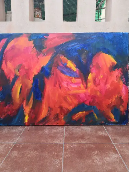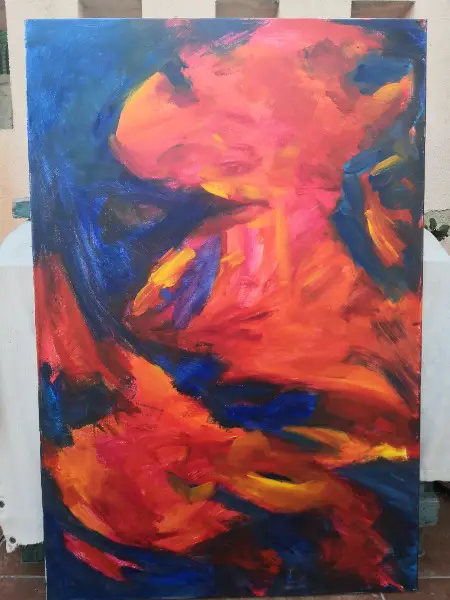 Abstrakte Kunst der deutschen Malerin Elke Mayer, Oel auf Leinwand, 80 x 120, Entstehungsjahr 1996, aus eigenem Atelier, mit Zertifikat. Bild kann auch quer aufgehaengt werden.