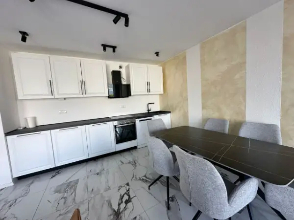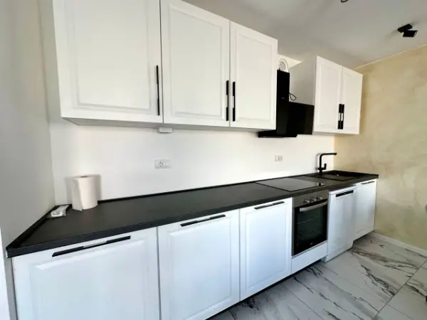 Zweistöckige Wohnung, 100 m², direkt am Wasser im Dorf Djuraševi?i, Luštica. Das Erdgeschoss verfügt über ein grosses Wohnzimmer mit Zugang zur Terrasse und eine Küche mit Essbereich.