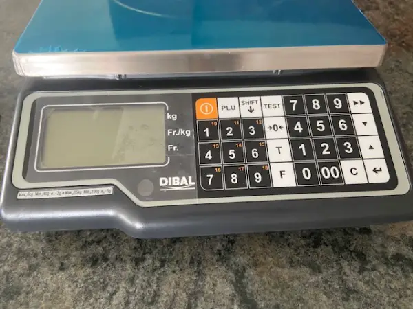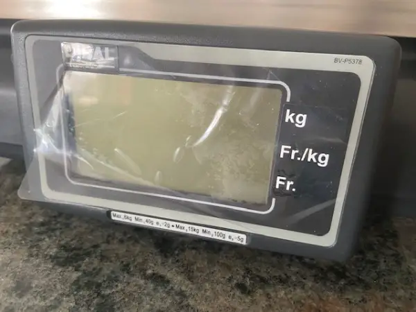 Anzeige von Gewicht, Preis/kg und Gesamtgewicht.