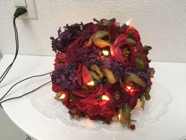 Sehr schöne, einmalige, blumige, dekorative Weihnachtskugel mit Lämpli. Stecker für 220 Volt, Kabellänge 1.50 m. Kugelhöhe 25 cm, Durchmesser 25 cm.