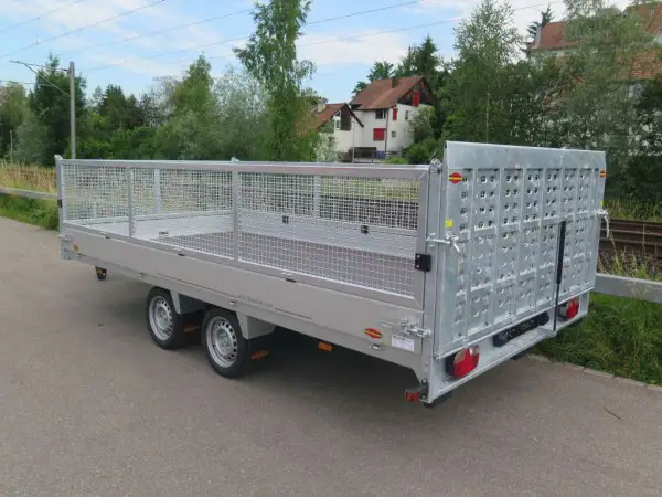 Innenlänge 500cm, Innenbreite 208cm, Bordwandhöhe 20cm Aluminium-elox., Stirnwand klappbar, Auffahrrampe aus verzinktem Lochblech mit Hebehilfe.