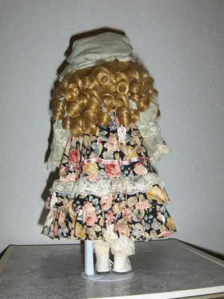 Porzellan Puppe mit buntem Blumenkleid 40 cm mit Ständer