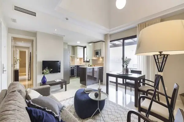 122 mq di appartamento completamente arredato con 2 camere da letto, 2 bagni, amplio terrazzo, piscine, reception, ristoranti e palestra.