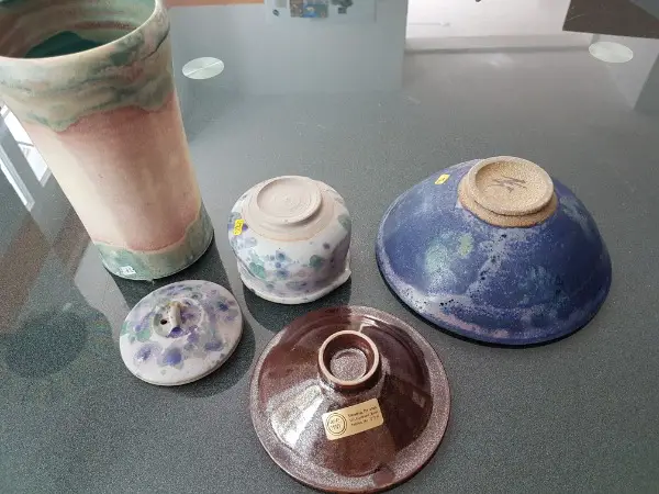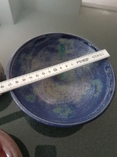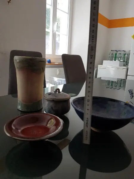 Bestehend aus einer Vase, einer blauen Schüssel, einem Kännchen, und einer sehr kleinen Schale. Verschiedene Farben. Nie gebraucht, teilweise Preisettikett noch angebracht.