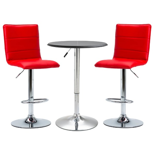 Dieses 3-teilige Barset mit modernem und zeitgemässem Design passt perfekt zu modernen Wohnungen, Gärten, Bars, Pubs oder Restaurants. Die Bartischplatte ist aus MDF gefertigt und leicht zu reinigen ist. Das verchromte Stahlgestell trägt zur Stabilität und Robustheit des Stehtisches bei. Zusätzlich ist dieser Tisch dank eines verstellbaren Mechanismus von 71 bis 92 cm höhenverstellbar, um verschiedenen Sitz- und Stehanforderungen gerecht zu werden. Die Barstühle sind mit pflegeleichtem Kunstleder bezogen, um optimalen Sitzkomfort zu bieten. Das verchromte Stahlgestell bietet hohe Stabilität, während der integrierte Standfuss für zusätzlichen Sitzkomfort sorgt. Das ergonomische Design macht die Stühle sehr bequem, um Ihnen stundenlangen Sitzkomfort zu bieten. Dank des Gasdruckfeders können diese Barstühle einfach in der Höhe verstellt werden. Der Tisch und die Stühle sind einfach zusammenzubauen. Lieferung inklusive 1 Bartisch und 2 Barstühlen.