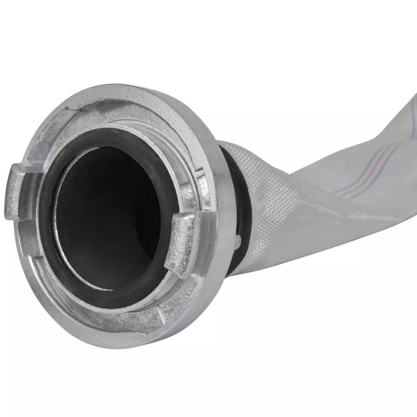 Wassertransport vorgesehen. Hergestellt aus wetterfestem Material, garantiert der Feuerlöschschlauch eine lange Lebensdauer und ausgezeichnete Haltbarkeit. Er verfügt auch über glattes PVC-Futter, das die Stauchung und die Blockierung des Schlauches verhindert und uneingeschränkten Wasserfluss ermöglicht. Hergestellt aus Hartaluminiumlegierung, können die Drei-Zoll-Storzkupplungen 8 bar Betriebsdruck standhalten. Dank der Storz-Kupplungen an beiden Enden, kann der Feuerwehrschlauch mit einem anderen Schlauch verbunden werden, um sich zu verlängern oder mit der Düse verbunden werden, um den Strahldruck vom Wasser zu erhöhen. Darüber hinaus ist der Flachschlauch leicht im Gewicht und kann als Spulen für einfache Lagerung und leichten