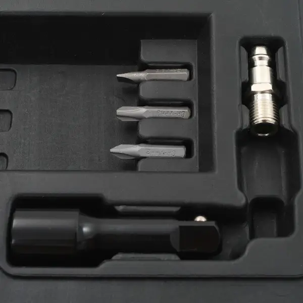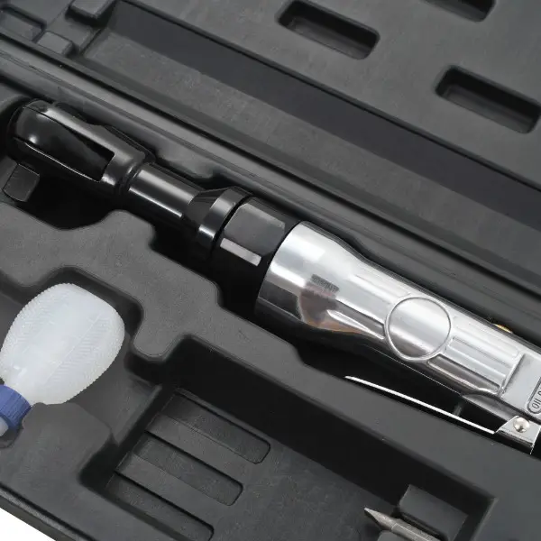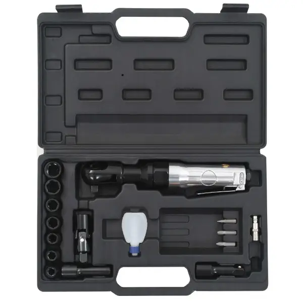 Werkzeugset ist für die Arbeiten in Werkstätten und Automobilwerkstätten unentbehrlich. Der Ratschenschlüssel verfügt über einen Luftauslass an der Vorderseite, seine Bewegungsrichtung kann mit dem Vorwärts-Rückwärtsschalter am Ratschenkopf im Uhrzeigersinn oder gegen den Uhrzeigersinn eingestellt werden. Sämtliche Teile werden in einem handlichen, blasgeformten Koffer ausgeliefert.