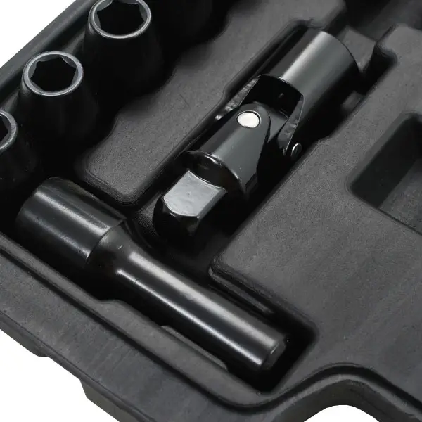 Steckschlüssel in verschiedenen Grössen, 1 Verlängerungsstange, 1 Nippel, 1 Kreuzgelenk, 1 Ölbehälter, 1 Bithalter und 3 Bits. Dieses