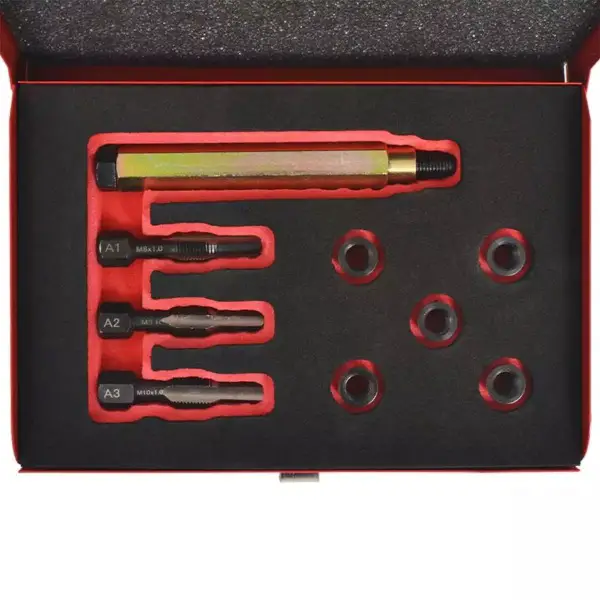 Werkzeug ist darauf ausgelegt, um beschädigte und abgenutzte Glühkerzengewinde zu reparieren. Dieses robuste und langlebige Set ist aus robustem Karbonstahl und legiertem Stahl hergestellt worden. Die Einsätze verfügen über vollständig feste und gasdichte Verschalungen. Alle Werkzeuge und Einsätze werden in einem stabilen Metallgehäuse geliefert, sodass sie einfach gelagert und transportiert werden können.