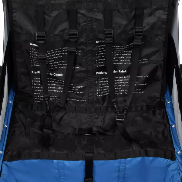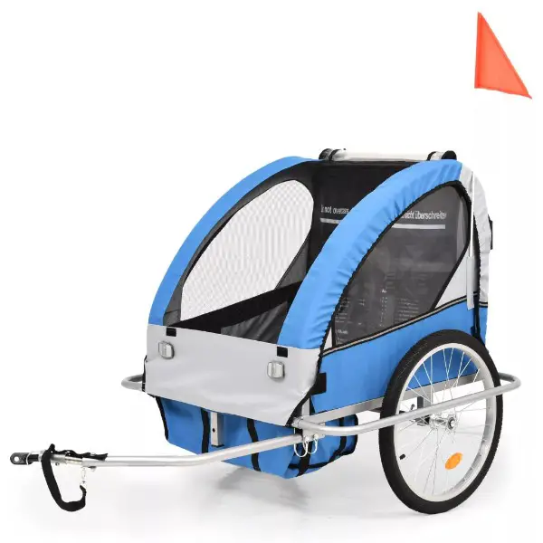 Dieser praktische Fahrradanhänger für Kinder lässt sich in Sekundenschnelle in einen Kinderwagen verwandeln und ist eine gute Möglichkeit, Kinder auf eine Fahrradtour mitzunehmen oder einen Spaziergang zu machen. Er ist für 1 bis 2 Kinder mit einem maximalen Gesamtgewicht von 40 kg geeignet. Dieser Fahrradanhänger für Kinder hat einen robusten Stahlrahmen und ist aus Oxford-Gewebe gefertigt, was ihn wasserabweisend, haltbar und pflegeleicht macht. Das Allwetterverdeck mit Insektenschutz bewahrt Ihre Kinder vor Regen oder Sonnenstrahlen, während zwei transparente Seitenfenster den kleinen Passagieren eine gute Aussicht ermöglichen. Sein 5-Punkte-Gurtsystem bietet optimale Sicherheit für Ihre Kinder. Der Kinder-Fahrradanhänger verfügt über eine gut sichtbare Farbgebung und Radreflektoren für maximale Sichtbarkeit und eine Handbremse am Vorderrad für zusätzliche Sicherheit beim Bergabfahren. Zwei Innentaschen bieten ausreichend Stauraum für Lebensmittel, Spielzeug und andere Dinge des täglichen Bedarfs. Sein Sicherheitsdrehgelenk sorgt dafür, dass der Anhänger beim Umfallen des Fahrrads aufrecht stehen bleibt. Dieser Kinder-Fahrradanhänger verfügt über eine Schnellkupplung für einfache Befestigung an einem Fahrrad. Dieser Fahrradanhänger kann zur einfachen Aufbewahrung und zum Transport auch zusammengeklappt werden. Eine Sicherheitsfahne ist auch im Lieferumfang enthalten, um die Sichtbarkeit zu erhöhen. Die Montage ist einfach.