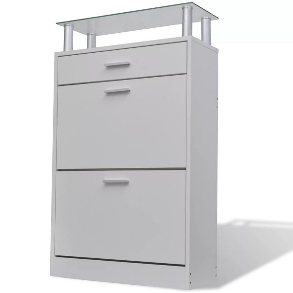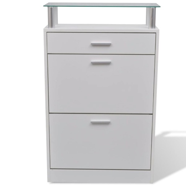- Mit 2 geräumigen Schuhkippern, 1 Schubfach und 1 Glas-Ablageregal oben