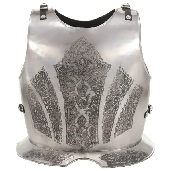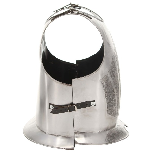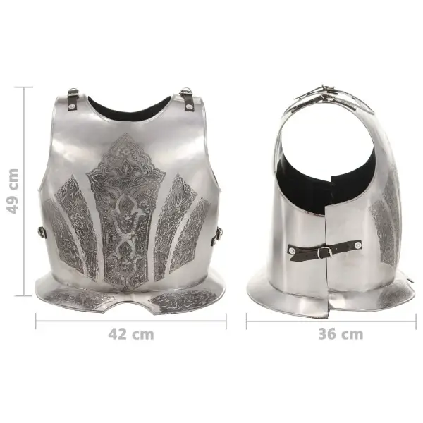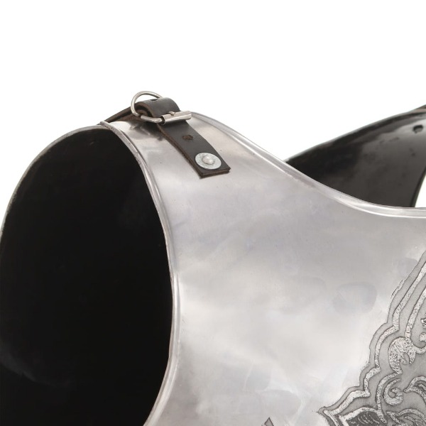 Lederriemen für eine bequeme Passform ausgestattet. Dieser Kürass kombiniert antiken Stil und robuste Materialien zu einer auffälligen Rüstung, die aus Stahl der Stärke 18 mit poliertem Finish gefertigt ist.