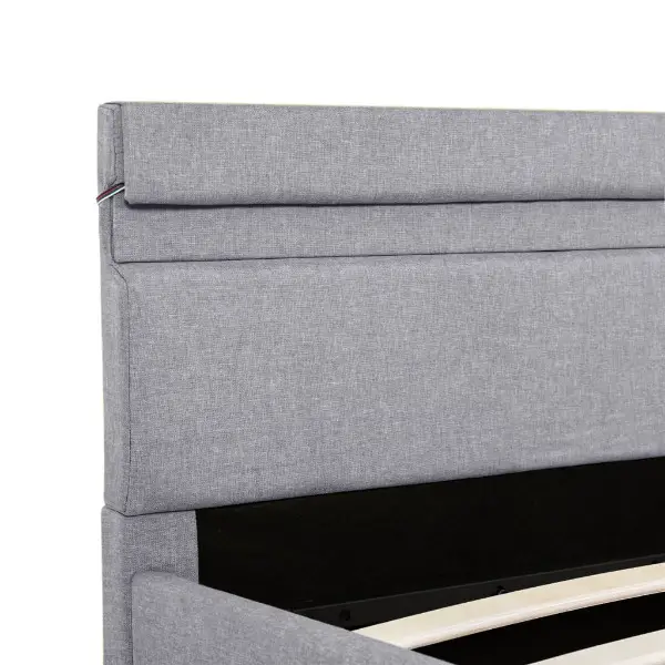 Lattenrost steht nach dem Anheben aufrecht, sodass Sie beide Hände frei haben, um darunter liegende Gegenstände zu entfernen oder zu verstauen. Der pulverbeschichtete Stahlrahmen und die Sperrholzlatten tragen zur Robustheit und Langlebigkeit des Bettes bei. Das mit strapazierfähigem Stoff gepolsterte Stauraumbett wirkt einladend und ist pflegeleicht. Dieser Artikel ist leicht zu montieren. Dieses