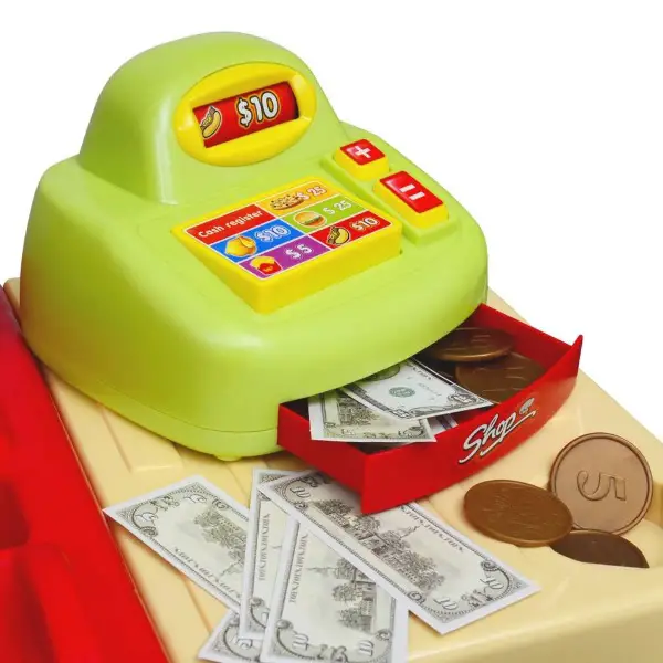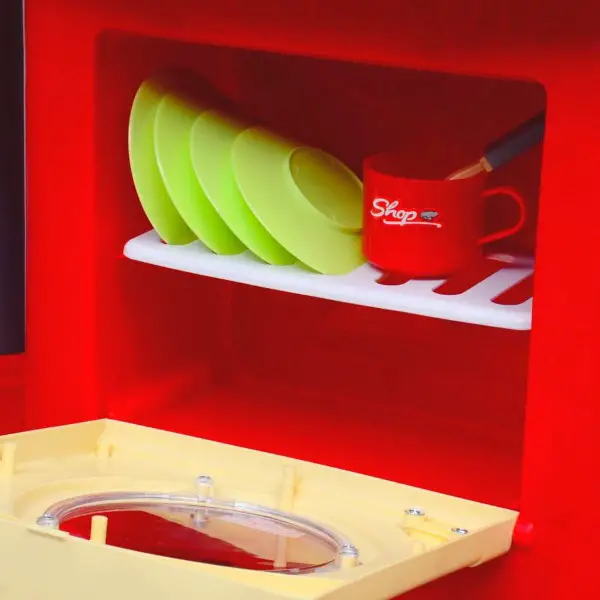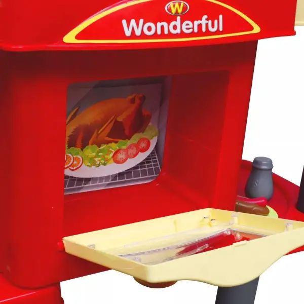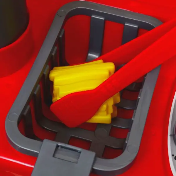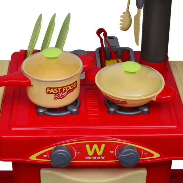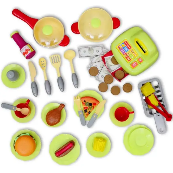 - Lieferumfang: 1 x Spielzeugküche, 2 x Tassen, 1 x Ketchup-Flasche, 1 x Ketchup-Flaschendeckel, 1 x inneres Tablett, 4 x Geschirr, 6 x Untersetzer, 1 x Salzstreuer, 3 x Löffel, 1 x Messer, 1 x Spachtel, 1 x Gabel, 1 x Zange, 3 x Chips, 1 x Spritzschutz, 1 x Bratpfanne, 1 x Topf, 2 x Pfannendeckel, 1 x Registrierkasse, 9 x Münzen, 9 x Bargeld, 1 x Pizza, 1 x Wurst im Hotdog, 1 x Brot im Hotdog, 1 x Hühnerbein, 2 x Brot im Hamburger, 1 x Gemüse im Hamburger, 1 x Fleischpastete im Hamburger