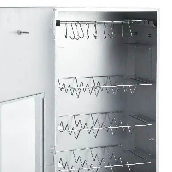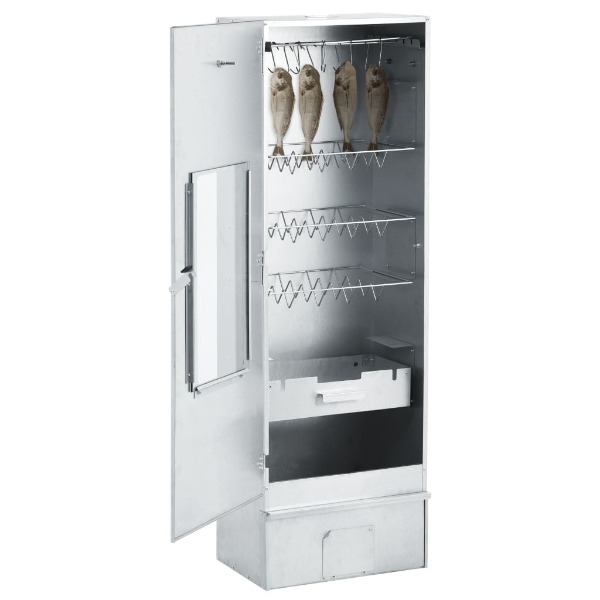 Fisch und Würstchen räuchern. Machen Sie ein Fest und geniessen Sie eine schöne Zeit im Freien mit Ihrer Familie! Dieser Räucherofen ist mit einem Thermometer ausgestattet, so dass Sie die aktuelle Ofentemperatur stets im Blick behalten. Durch das Fenster können Sie den Räuchervorgang beobachten. Der 124 cm hohe Räucherofen bietet viel Platz zum Räuchern auch von grossen Fleischstücken. Der Outdoor-Grill besteht aus verzinktem Stahl und ist für den Aussenbereich geeignet. Dank der Verzinkung des Regals, der