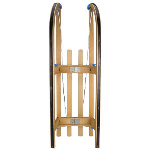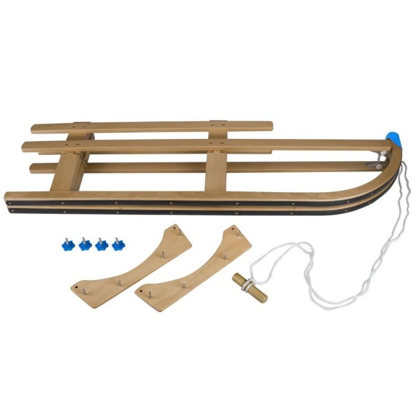 Holzgriff und Schutzkappen. Der Schlitten ist TÜV-geprüft und kann mit maximal 90 kg belastet werden. Im Lieferumfang enthalten sind Edelstahl-