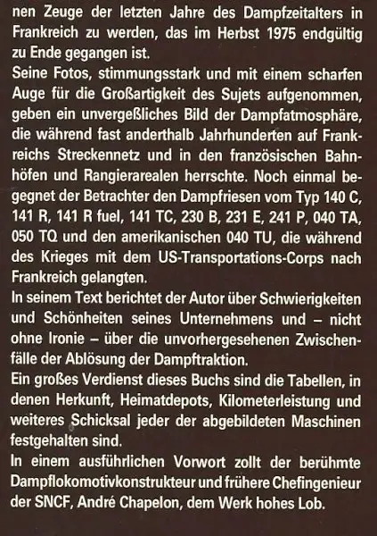 Frankreichs letzte Dampflokomotiven von H.Bosshard, erschienen 1976 im Orell Füssli Verlag Zürich, im Format 31x24,5 cm, sehr gute Erhaltung. Kontaktaufnahme am besten via trovas.ch (E-Mail), keine SMS.