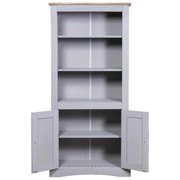 Kiefernholz gefertigt, ist der Schrank stabil und robust. Die 3 offenen, oberen Regalböden eignen sich ideal zum Aufbewahren von Büchern oder Glaswaren und zum Ausstellen dekorativer Gegenstände. Hinter den Türen im unteren Teil des Schrankes verbergen sich zwei weitere Regalböden, die zusätzlichen
