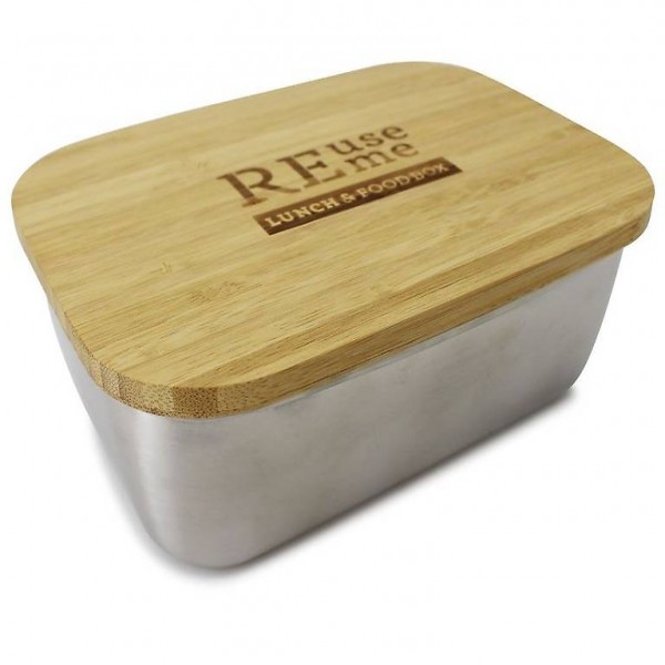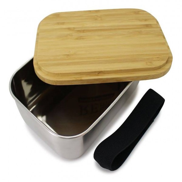 Box aus Edelstahl poliert, mit praktischen Deckel aus Bambus.